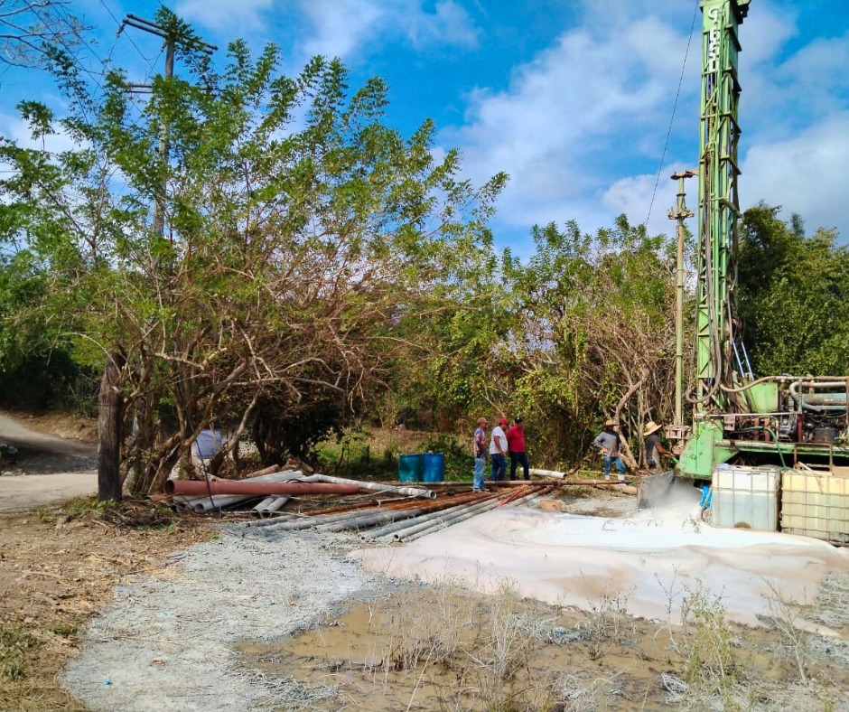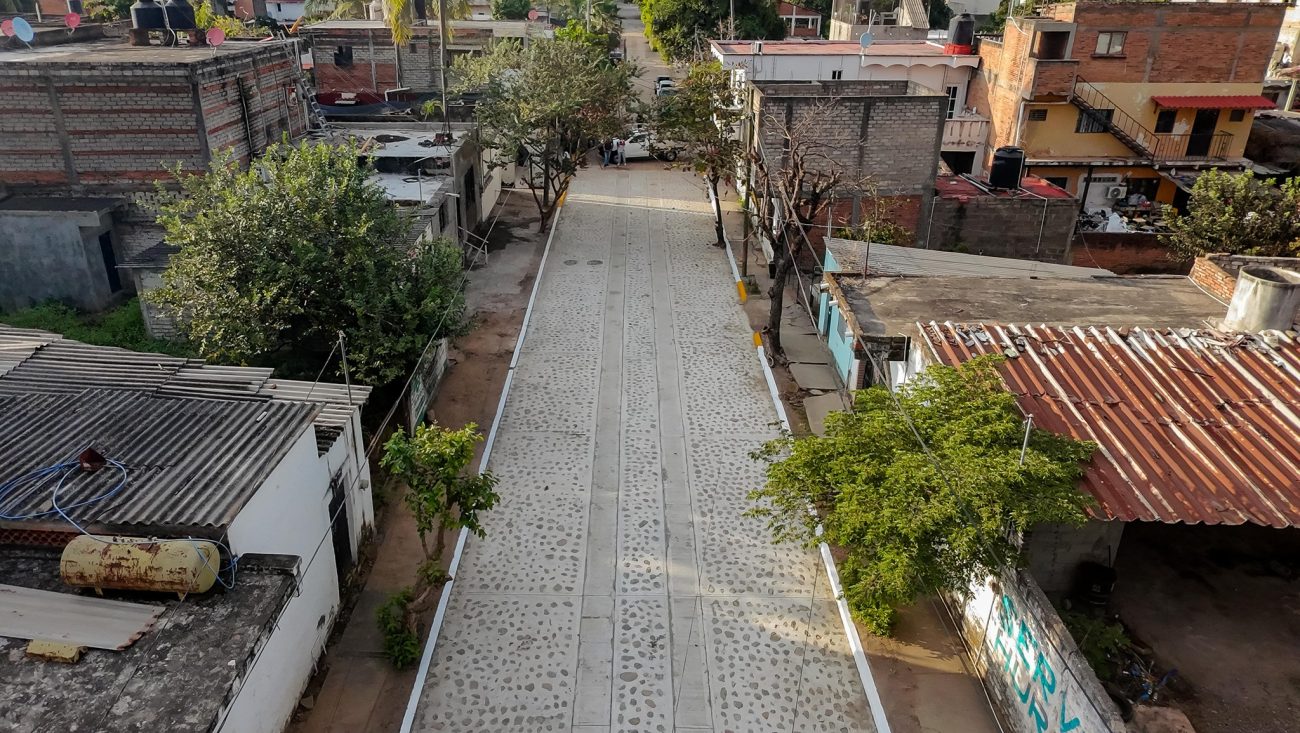 Entrega de obra empedrado ahogado en cemento con huellas de concreto en la calle Lucio Blanco, en La Peñita de Jaltemba