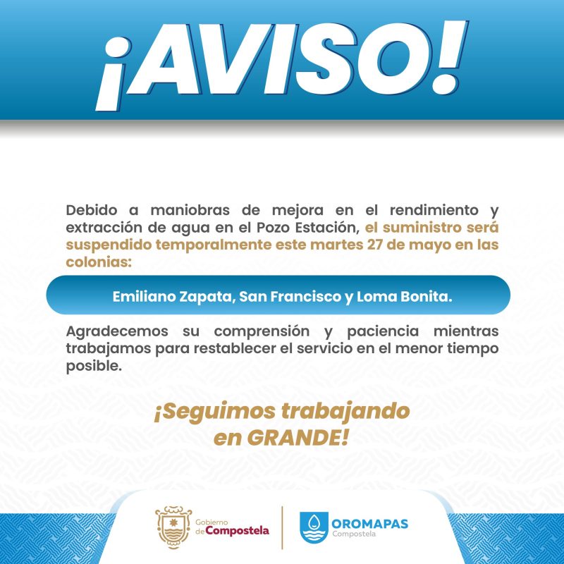 Debido a maniobras de mejora en el rendimiento y extracción de agua en el Pozo Estación, el suministro será suspendido temporalmente este martes 27 de mayo en las colonias Emiliano Zapata, San Francisco y Loma Bonita.