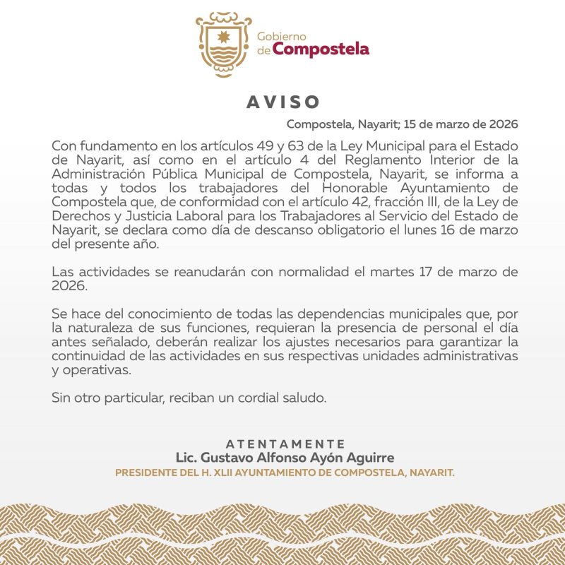 Lunes 16 de marzo del presente año, se declara como día de descanso obligatorio