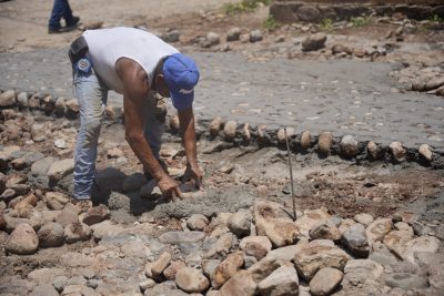Se avanza con los trabajos de bacheo con empedrado ahogado en la calle Allende, de la colonia Lázaro Cárdenas.