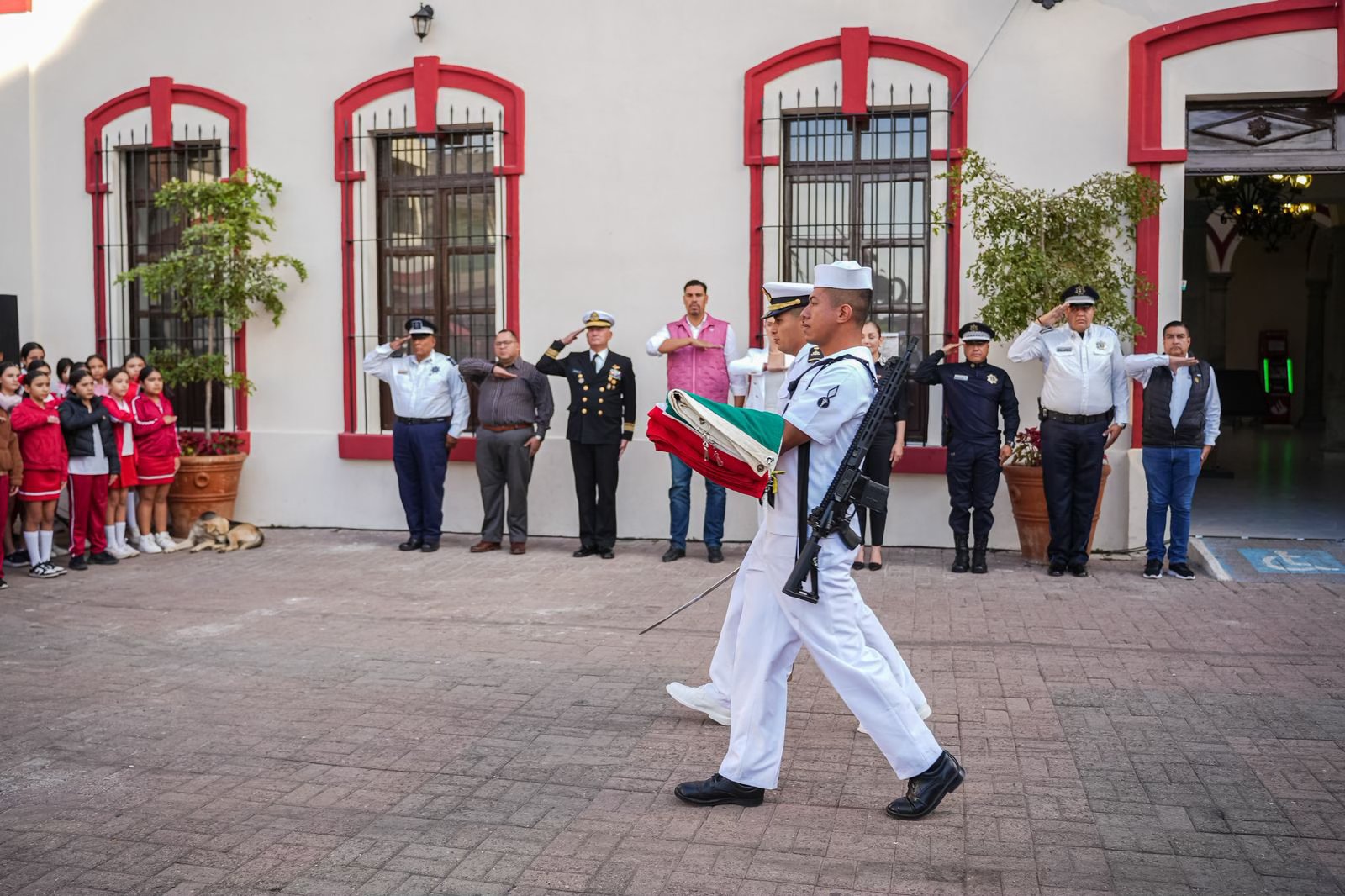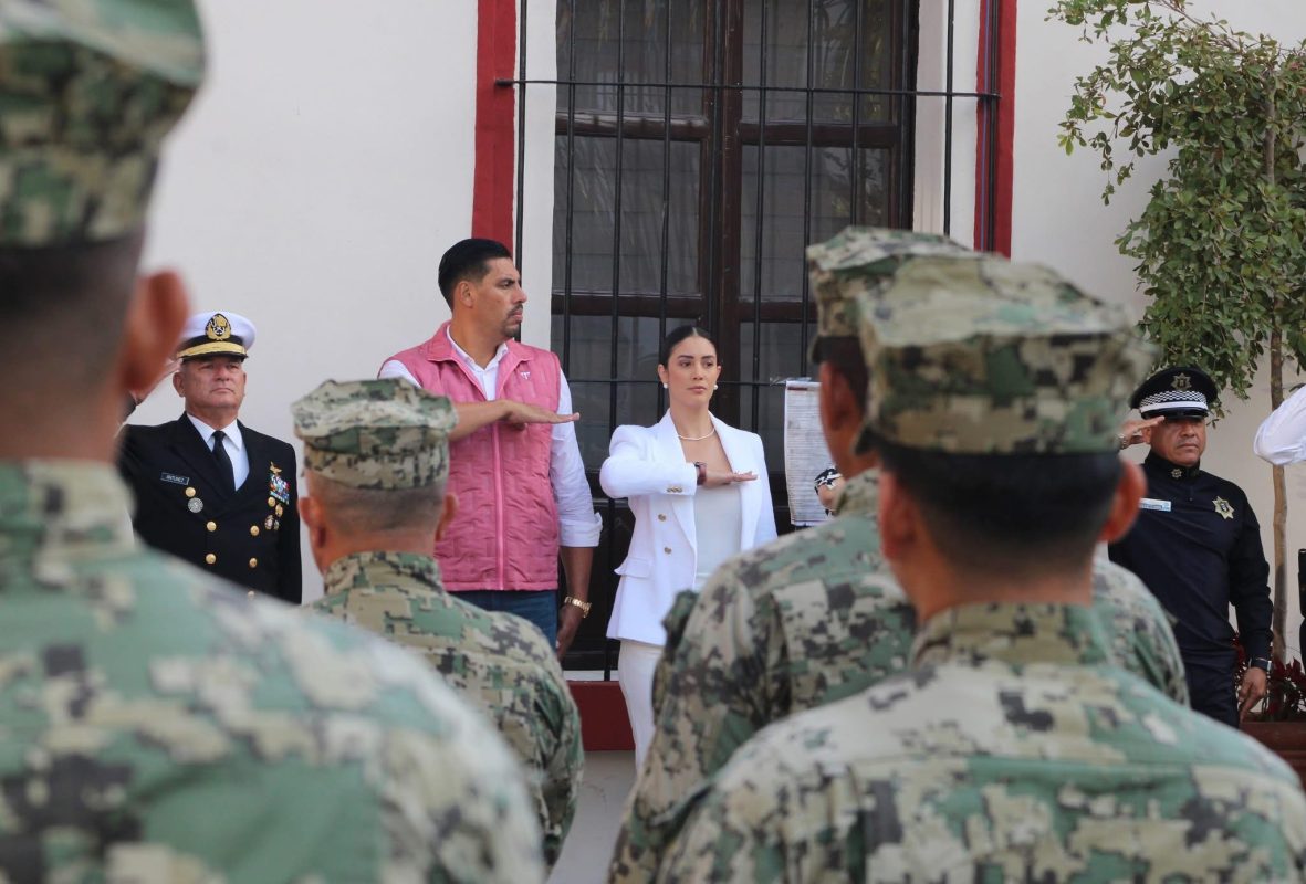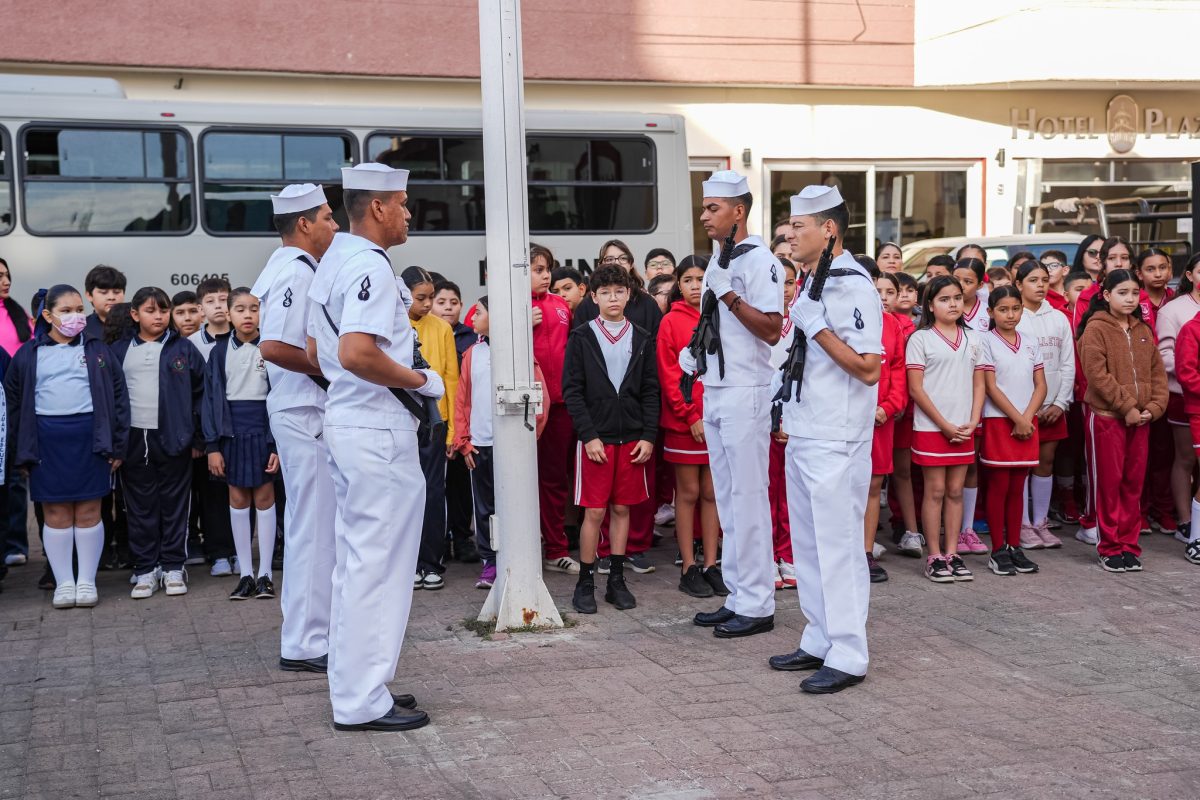 Desde la explanada de Palacio Municipal se llevaron a cabo los Honores a la Bandera, en compañía del alcalde Gustavo Ayon y su esposa, Estefania Carrillo, en conmemoración del aniversario de la Promulgación de la Constitución Política de los Estados Unidos Mexicanos.